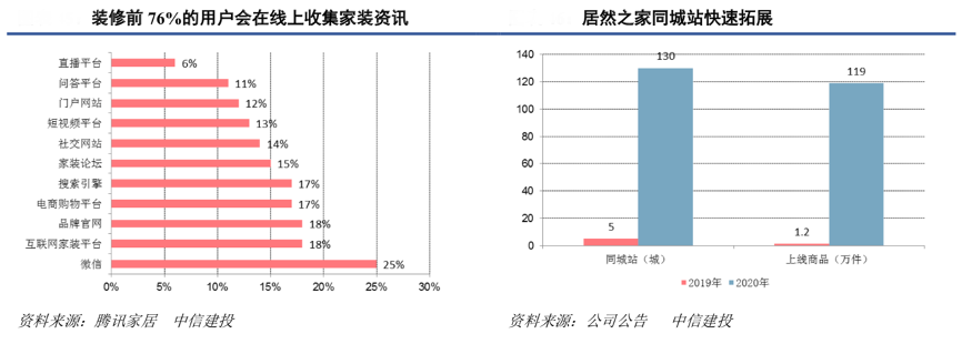 經(jīng)典案例:根據(jù)公司公告、騰訊家居、中信建投等綜合資訊表明,居然之家與阿里巴巴攜手對(duì)天貓平臺(tái)的“居然之家”官方旗艦店進(jìn)行了改造升級(jí),將傳統(tǒng)的電商店鋪升級(jí)為基于本地化特色商品及服務(wù)的“同城站”。2020年居然之家公司加速推動(dòng)同城站建設(shè),以同城站為核心,以直播為前端營(yíng)銷抓手,賦能本地經(jīng)銷商,最終轉(zhuǎn)化線上消費(fèi)轉(zhuǎn)回線下實(shí)體店,實(shí)現(xiàn)線上線下融合。2020 年,公司同城站從 年初的覆蓋 5 城快速增長(zhǎng)至 130 城,上線商品從年初的 1.2 萬(wàn)件增加至 119 萬(wàn)件,全年同城站引導(dǎo)成交 84.5 億 元。