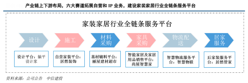 經(jīng)典案例:根據(jù)公司公告、中信建投等綜合資訊表明,居然之家持續(xù)推進產(chǎn)業(yè)鏈上下游布局,通過拓展自營和IP 業(yè)務(wù),建設(shè)家裝家居行業(yè)全鏈條服務(wù)平臺。其通過拓展自營和 IP 業(yè)務(wù)六大賽道,打造設(shè)計、施工、基材輔材采 購、智能家居及家居用品銷售、物流和后家裝服務(wù)等全鏈路交付和服務(wù)能力,努力建設(shè)數(shù)字化時代下家居行業(yè)產(chǎn)業(yè)服務(wù)平臺,向家居行業(yè)設(shè)計師、家裝公司、商戶、廠家賦能的同時不斷改善消費者服務(wù)體驗。