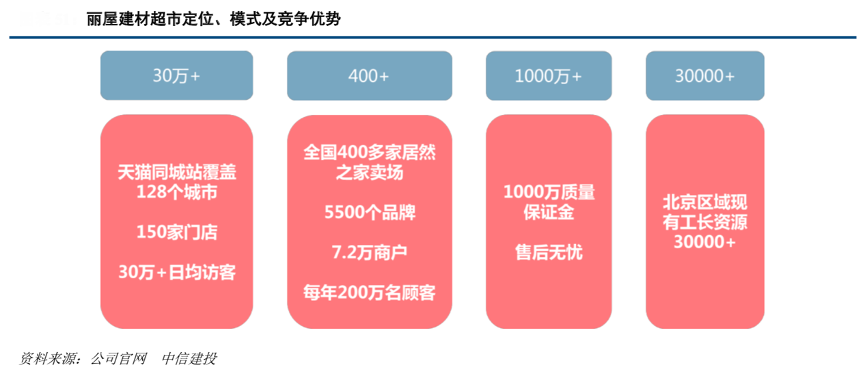 經(jīng)典案例:根據(jù)公司公告、中信建投等綜合資訊表明,麗屋輔材為了給家裝工長提供高品質(zhì)、多元化的主材及輔材選擇,同時賦能行業(yè)中的主材、輔材商,麗屋輔材+裝修基材輔料采購平臺將采取 B2B2C 和 B2C 相結(jié)合的運營模式,一方面從供應(yīng)端加大 IP 自有品牌業(yè)務(wù)的開發(fā),提升裝修基材和輔材的品質(zhì);另一方面免費為 B 端施工隊和 C 端客戶提供配送服務(wù),解決行業(yè)痛點。2020 年 5 月輔材+APP 已實現(xiàn)上線并開始推廣使用,實現(xiàn)了工長線上訂貨、線下配送的服務(wù)模式。