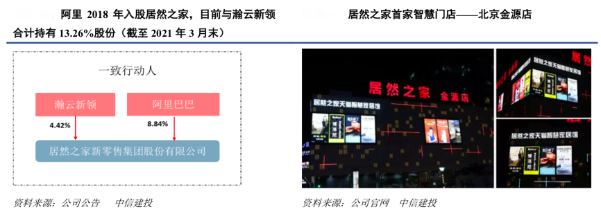 經(jīng)典案例:根據(jù)公司公告、中信建投等綜合資訊表明,居然之家 2018 年初開始與阿里巴巴達(dá)成深度戰(zhàn)略合作,以大數(shù)據(jù)平臺(tái)建設(shè)為核心,全面推進(jìn)線上線下融合,打造家居新零售新模式。2018 年 2 月 11 日,阿里巴巴以54.53 億元收購(gòu)居然之家 15%股份,同時(shí)其借助阿里巴巴強(qiáng)大的大數(shù)據(jù)、云計(jì)算、智能硬件等零售技術(shù)能力,居然之家圍繞賣場(chǎng)數(shù)字化、線上增量平臺(tái)、門店存量轉(zhuǎn)化等三方面對(duì)賣場(chǎng)進(jìn)行持續(xù)改造升級(jí)。