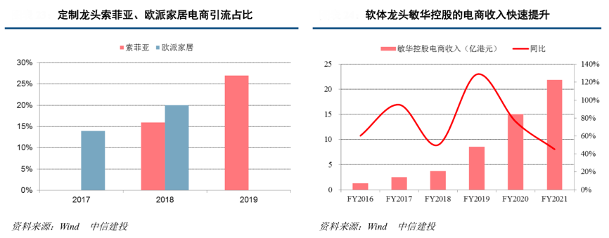 經(jīng)典案例:根據(jù)wind、中信建投等綜合資訊表明,以定制家居為例,盡管由于其高單值、重服務(wù)、講體驗(yàn)等仍以線下成交為主,但線上引流、線上線下一體化消費(fèi)場(chǎng)景正在形成,線上占比逐步提升,其中 2019 年歐派 家居電商引流收入占比預(yù)計(jì)超 20%,索菲亞線上引流客戶占比從 2018 年的 16%提升至 2019 年的 27%。而軟體家具由于服務(wù)屬性較輕,可在線上直接形成交付,電商也成為龍頭發(fā)力的有效渠道。其中敏華控股 2020 財(cái)年電商收入同增超 80%,內(nèi)銷收入占比同比大幅提升 9.2pct 至 27.8%;2021 財(cái)年電商收入同比增長(zhǎng)超 45%,占比保 持24%+。