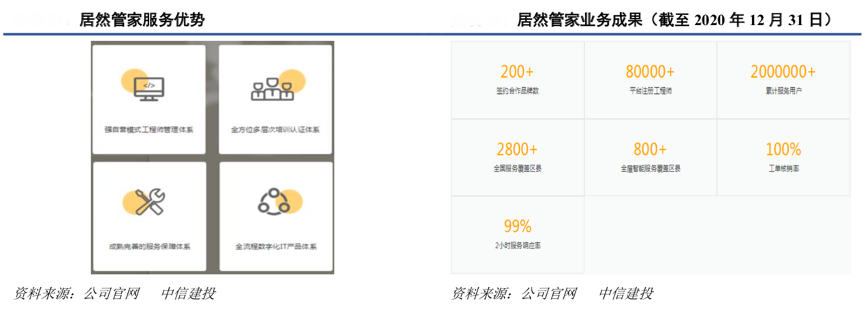 經(jīng)典案例:根據(jù)公司公告、中信建投等綜合資訊表明,“居然管家”定位為一站式后家裝智能服務(wù)平臺,以居然之家龐大的客戶資源為依托,以大數(shù)據(jù),云計算、人工智能為驅(qū)動力,釆用 B2B2C 和 B2C 的運營模式,以智能家居、水電風暖為切入點,為顧客提供后家裝的設(shè)備保養(yǎng)、維修更新等到家服務(wù),通過強自營工程師管理以及平臺智能派單機制確保服務(wù)交付品質(zhì),與居然之家其他業(yè)務(wù)形成閉環(huán)。2020 年平臺注冊工程師 達到 8.9 萬人,同比增長 97%;目前平臺全國服務(wù)覆蓋區(qū)縣 2000+,工單核銷率 100%,累計服務(wù)用戶數(shù) 200+ 萬。