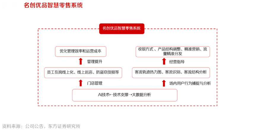 經(jīng)典案例:根據(jù)公司公告、東方證券研究所等綜合資訊表明,名創(chuàng)優(yōu)品各個門店基本覆蓋智慧門店系統(tǒng),基于對消費者店內(nèi)消費行為模式以及產(chǎn)品銷售趨勢的分析,決定各門店的產(chǎn)品組合,完成門店之間的合理分配,實現(xiàn)庫存風險最小化。根據(jù) FY2020 數(shù)據(jù),國內(nèi)市場方面進店客流量超過 4.16 億人次,約 30%消費者進行購買行為。在用戶畫像方面,80%到店消費者年齡低于 40 歲,60%到店消費者年齡低于 30 歲,20-30 歲人群消費能力最強,符合公司的核心客群定位。