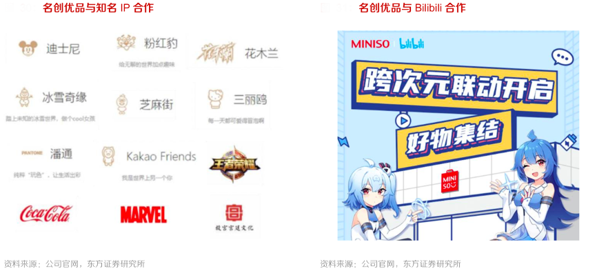 經(jīng)典案例:根據(jù)公司官網(wǎng)、東方證券研究所等綜合資訊表明,名創(chuàng)優(yōu)品公司 11 個大類商品核心 SKU 約為8000+,其中每個門店 SKU 數(shù)約為 3000 個。名創(chuàng)優(yōu)品基本維持每年 4 次以上的 IP 聯(lián)名企劃,與迪士尼、漫威、可口可樂等全球知名 IP 授權(quán)方建立合作關(guān)系, FY2020 公司推出了 2300 款核心聯(lián)名企劃商品,緊貼年輕消費群體的消費潮流,幫助公司進一步擴大品牌知名度。