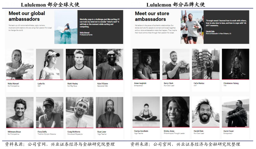 經(jīng)典案例:根據(jù)公司官網(wǎng)、興業(yè)證券經(jīng)濟(jì)與金融研究院等綜合資訊表明,相較于簽約體育明星等擁有泛化粉絲群體的傳播方式不同,lululemon 選擇與區(qū)域內(nèi) KOL 合作打造品牌大使成本更低且更高效。截止 2021 年 4 月 19 日,lululemon 全球大使共 42 位,囊括了瑜伽、冥想、游泳、馬拉松、拳擊等領(lǐng)域的杰出運(yùn)動(dòng)員。門店大使范圍更寬泛,還包括企業(yè)家、演講者、營養(yǎng)師、 音樂家等各個(gè)領(lǐng)域。這其中最重要的品牌大使是瑜伽場館教練,lululemon為品牌 大使提供諸多福利,包括服裝配額、新品試穿、官網(wǎng)等社交媒體宣傳等,lululemon 把每一座瑜伽館,都變成了售賣場。