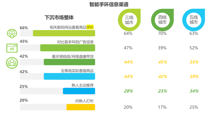 經(jīng)典案例:根據(jù)《20210513-艾瑞咨詢-科技行業(yè)“下沉”專題系列報告》等綜合資訊表明,垂直網(wǎng)站的商品評價、廣告信息和評測視頻是下沉市場了解智能手環(huán)商品信息的主要渠道。