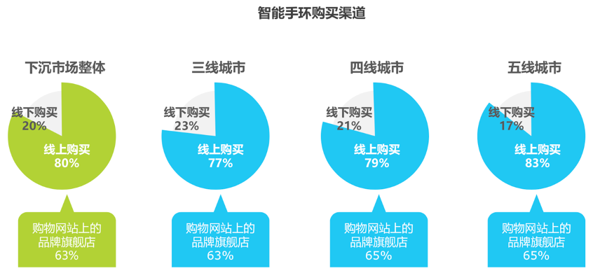 經(jīng)典案例:根據(jù)《20210513-艾瑞咨詢-科技行業(yè)“下沉”專題系列報告》等綜合資訊表明,隨著城市級別降低,線上購買占比逐漸增加。五線城市超過八成消費者在線上購買智能手環(huán),其中六成消費者在品牌旗艦店購買。品牌在旗艦店的選品、精準營銷、大促活動等方面極為發(fā)展?jié)摿Α?
