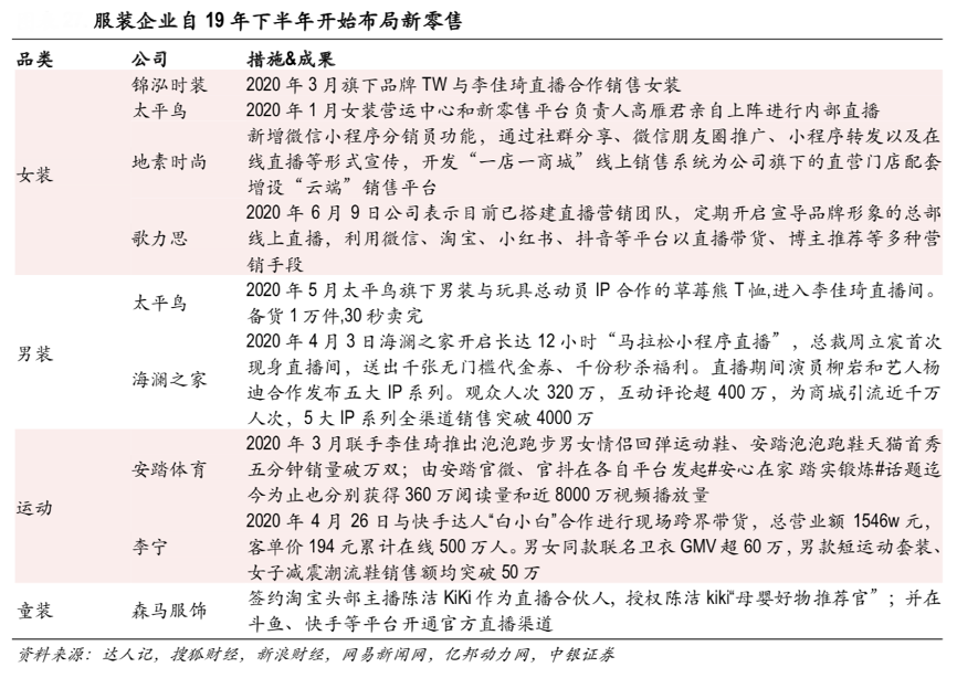 經(jīng)典案例:根據(jù)達(dá)人記、搜狐財(cái)經(jīng)、新浪財(cái)經(jīng)、網(wǎng)易新聞網(wǎng)、億邦動(dòng)力網(wǎng)、中銀證券等綜合資訊表明,紡織服裝龍頭品牌近年來(lái)大力布局線上渠道,積極開拓電商業(yè)務(wù),探索新零售渠道。例如森馬服飾簽約淘寶頭部主播陳潔Kiki 作為直播合伙人,積極開展童裝等領(lǐng)域的帶貨;太平鳥通過微信線上會(huì)員專場(chǎng)、小程序分銷、直播等創(chuàng)新場(chǎng)景打通與消費(fèi)者的連接,利用大數(shù)據(jù)進(jìn)行多維度精準(zhǔn)營(yíng)銷。