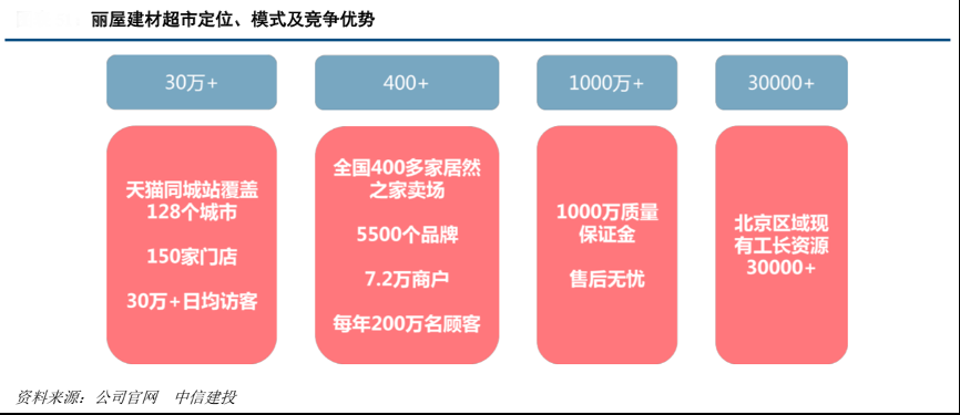 經(jīng)典案例:根據(jù)公司官網(wǎng)、中信建投等綜合資訊表明,麗屋輔材超市對(duì)標(biāo)全球最大的建材零售商家得寶(Home-Depot),為了給家裝工長(zhǎng)提供高品質(zhì)、多元化的主材及輔材選擇,同時(shí)賦能行業(yè)中的主材、輔材商,麗屋輔材+裝修基材輔料采購(gòu)平臺(tái)將采取 B2B2C 和 B2C 相結(jié)合的運(yùn)營(yíng)模式,一方面從供應(yīng)端加大 IP 自有品牌業(yè)務(wù)的開(kāi)發(fā),提升裝修基材和輔材的品質(zhì);另一方面免費(fèi)為 B 端施工隊(duì)和 C 端客戶(hù)提供配送服務(wù),解決行業(yè)痛點(diǎn)。2020 年 5 月輔材+APP 已實(shí)現(xiàn)上線(xiàn)并開(kāi)始推廣使用,實(shí)現(xiàn)了工長(zhǎng)線(xiàn)上訂貨、線(xiàn)下配送的服務(wù)模式。預(yù)計(jì) 2021~2022 年,麗屋輔材+將完成 APP 建設(shè),供應(yīng)鏈整合深耕北京市場(chǎng)。