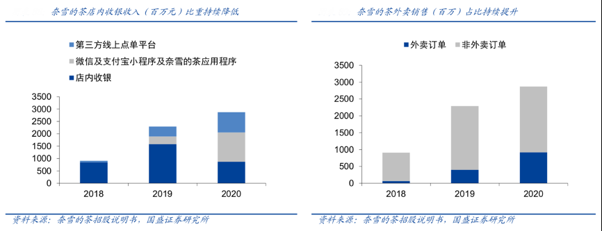 經(jīng)典案例:根據(jù)奈雪的茶招股說明書、國盛證券研究所等綜合資訊表明,受到疫情影響及公司持續(xù)布局小程序等點(diǎn)單渠道,2020 年,奈雪的茶公司微信及支付寶小程序銷售收入占比為 41.2%,占比持續(xù)攀升,店內(nèi)收銀占比為 30.4%,第三方線上點(diǎn)單平臺(tái)銷售收入占比為 41.2%(包括自提訂單)。2018-2020 年,奈雪門店外賣訂單銷售收入占比 由 7.5%逐步攀升至 31.9%。公司數(shù)字化發(fā)展下,信息系統(tǒng)能夠整合線上及線下交易信息,積累消費(fèi)者數(shù)據(jù),利用多渠道數(shù)據(jù)來針對(duì)性進(jìn)行產(chǎn)品設(shè)計(jì)、營銷推廣。