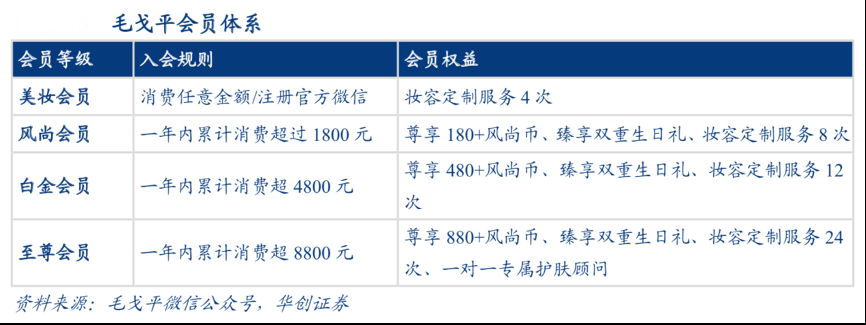 經(jīng)典案例:根據(jù)毛戈平微信公眾號(hào)、華創(chuàng)證券等綜合資訊表明,毛戈平注重會(huì)員管理,顧客忠誠(chéng)度極高。其會(huì)員體系分為美妝會(huì)員、風(fēng) 尚會(huì)員、白金會(huì)員和至尊會(huì)員四個(gè)等級(jí),2015 年毛戈平至尊會(huì)員(12 個(gè)月內(nèi)累計(jì)消費(fèi)8800 元)復(fù)購(gòu)率高達(dá) 68.38%(指復(fù)購(gòu)品牌旗下產(chǎn)品)。