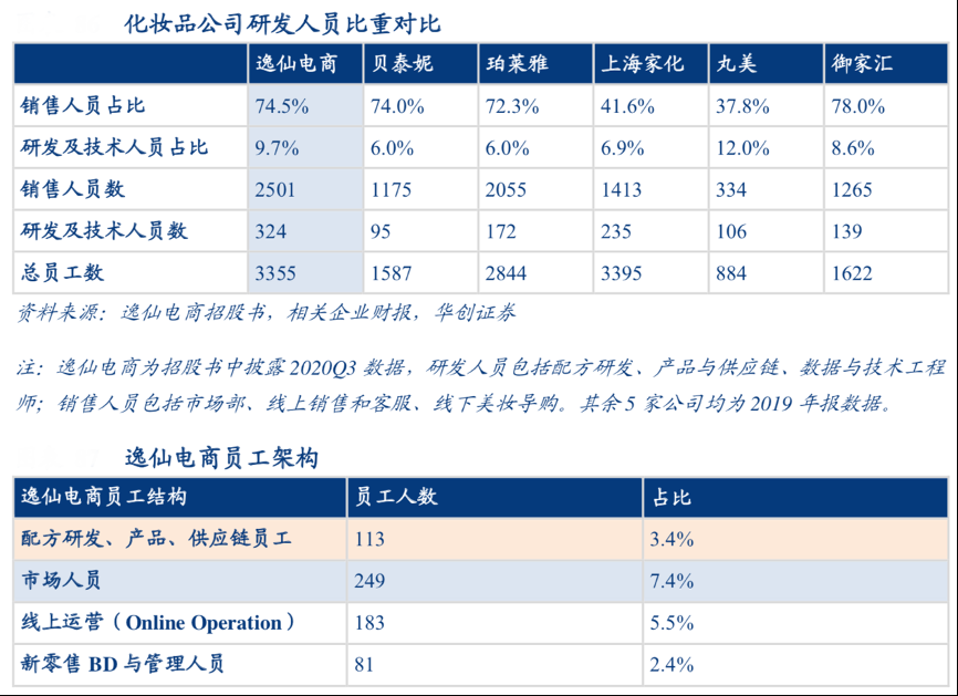 經(jīng)典案例:根據(jù)逸仙電商招股書、相關(guān)企業(yè)財(cái)報(bào)、華創(chuàng)證券等綜合資訊表明,截止 20Q3,逸仙電商技術(shù)團(tuán)隊(duì)擁有 211 名數(shù)據(jù)與技 術(shù)工程師, 113 名產(chǎn)品與供應(yīng)鏈研發(fā)人員,以及 1056 名線上銷售客服/1196 名線下 BA, 銷售與研發(fā)人員均高于行業(yè)平均水平。結(jié)合招股書披露數(shù)據(jù),逸仙電商公司技術(shù)團(tuán)隊(duì)開發(fā)一系列內(nèi)部系統(tǒng)(包括KOL 管理系統(tǒng)、“小完子”微信后臺(tái)以及實(shí)時(shí)大數(shù)據(jù)后臺(tái)),與阿里云與騰訊均有合作。技術(shù)人員除了負(fù)責(zé)用戶界面平臺(tái)設(shè)計(jì)外,將市場(chǎng)趨勢(shì)、KOL 內(nèi)容以及社交平臺(tái)用戶行為數(shù)據(jù)分析處理,指導(dǎo)產(chǎn)品研發(fā)、廣告投放等運(yùn)營(yíng)決策。
