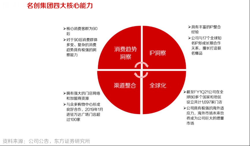 經(jīng)典案例:根據(jù)公司公告、東方證券研究所等綜合資訊表明,名創(chuàng)優(yōu)品全面升級(jí)為名創(chuàng)集團(tuán),積極擁抱互聯(lián)網(wǎng),實(shí)現(xiàn)線上線下的消費(fèi)聯(lián)動(dòng)。憑借現(xiàn)有的“消費(fèi)趨勢(shì)洞察、IP 洞察能力、渠道整合能力和全球化四大能力和技術(shù)、營(yíng)銷、人力資源、財(cái)務(wù)“四大中臺(tái)優(yōu)勢(shì)”,轉(zhuǎn)型品牌孵化新零售平臺(tái)。