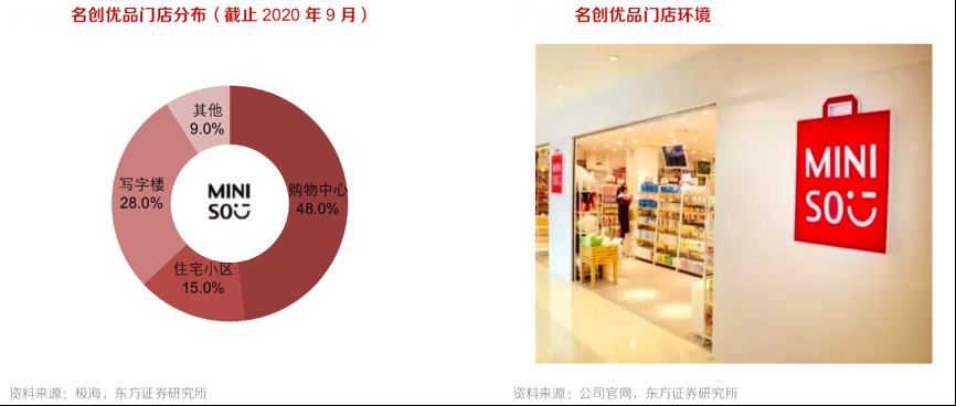 經(jīng)典案例:根據(jù)極海、公司官網(wǎng)、東方證券研究所等綜合資訊表明,截止 2020 年 9 月末,名創(chuàng)優(yōu)品公司近50%的門店選址高流量的購物中心,其建立了一系列的標(biāo)準(zhǔn)制度指導(dǎo)門店裝修和商品陳設(shè),具有三大特征: 白色基調(diào)、空間開闊和太空箱。其在貨架高度、貨品陳列方面也進行詳細研究,打造令顧客滿意 的購物環(huán)境;店內(nèi)不設(shè)導(dǎo)購,給予消費者充分的挑選空間。根據(jù)名創(chuàng)優(yōu)品公司披露的數(shù)據(jù),消費者對商品、服務(wù)和門店環(huán)境的好評率均在90%左右。