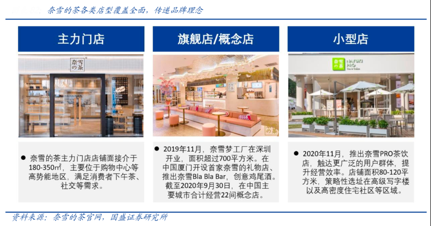 經(jīng)典案例:根據(jù)奈雪的茶官網(wǎng)、國泰證券研究所等綜合資訊表明,奈雪的茶門店多層次布局,滿足消費者多元化需求。 奈雪的茶標(biāo)準(zhǔn)店:茶飲主力門店店鋪主要位于購物中心等高勢能地區(qū),為奈雪的傳統(tǒng)門店。奈雪旗艦店:包括奈雪夢工廠、奈雪的禮物店以及奈雪Bla Bla Bar,向消費者傳遞多元化體驗。奈雪于 2020 年 11 月推出奈雪PRO 門店,其店鋪面積介于 80-120 平方米,選址在高級寫字樓即高密度住宅等區(qū)域。