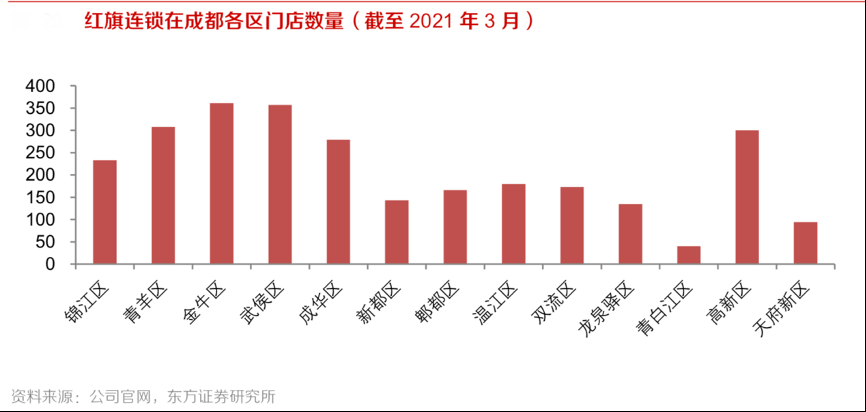 經(jīng)典案例:根據(jù)公司官網(wǎng)、東方證券研究所等綜合資訊表明,紅旗連鎖公司門店主要其中于成都市,其中92.3%都集中于成都市,7.7%分布于其他縣市。其公司在大成都范圍及周邊市區(qū)形成了網(wǎng)絡(luò)布局優(yōu)勢,同時(shí)其門店通常選址于所在城市的黃金地段或預(yù)計(jì)具有良好發(fā)展?jié)摿Φ纳倘Α?