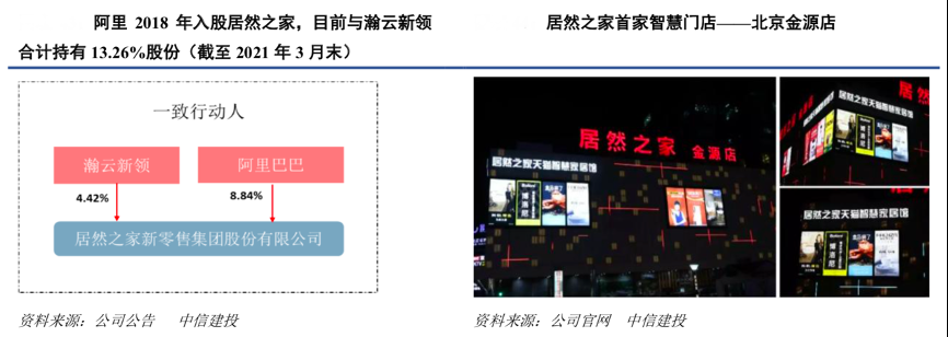 經(jīng)典案例:根據(jù)公司公告、公司官網(wǎng)、中信建投等綜合資訊表明,居然之家 2018 年初開始與阿里巴巴達(dá)成深度戰(zhàn)略合作,以大數(shù)據(jù)平臺建設(shè)為核心,全面推進(jìn)線上線下融合,打造家居新零售新模式。2018 年 2 月 11 日,阿里巴巴以 54.53 億元收購居然之家 15%股份,借殼上市后目前阿里持有公司股份 8.84%成為公司第三大股東,借助阿里巴巴強大的大數(shù)據(jù)、云計算、智能硬件等零售技術(shù)能力,居然之家圍繞賣場數(shù)字化、線上增量平臺、門店存量轉(zhuǎn)化等三方面對賣場進(jìn)行持續(xù)改造升級。