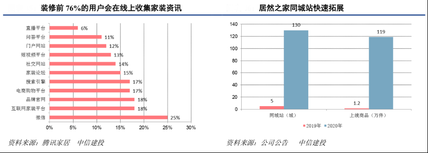 經(jīng)典案例:根據(jù)公司公告、騰訊家居、中信建投等綜合資訊表明,居然之家與阿里巴巴攜手對天貓平臺的“居然之家”官方旗艦店進(jìn)行了改造升級,將傳統(tǒng)的電商店鋪升級為基于本地化特色商品及服務(wù)的“同城站”。2020年居然之家公司加速推動同城站建設(shè),以同城站為核心,以直播為前端營銷抓手,賦能本地經(jīng)銷商,最終轉(zhuǎn)化線上消費轉(zhuǎn)回線下實體店,實現(xiàn)線上線下融合。2020 年,公司同城站從 年初的覆蓋 5 城快速增長至 130 城,上線商品從年初的 1.2 萬件增加至 119 萬件,全年同城站引導(dǎo)成交 84.5 億 元。