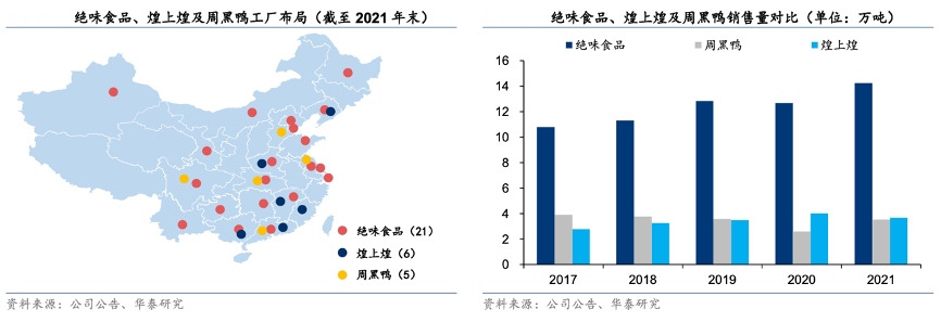 經(jīng)典案例:根據(jù)公司公告、華泰研究等綜合資訊表明,2021年絕味銷售量達 14.2 萬噸,遠高于煌上煌/周黑鴨的3.7/3.5 萬噸。銷售規(guī)模優(yōu)勢下其已形成全國化 工廠及終端門店先發(fā)布局優(yōu)勢。生產(chǎn)端,至 21 年末其已在全國范圍內(nèi)建立了 21 個生產(chǎn)基地(2 家在建),同期煌上煌/周黑鴨工廠數(shù)為6/5個;銷售端,絕味食品2021年年報顯示,至2021年末,其門店數(shù)達 13714 家,已覆蓋至國內(nèi) 31 個省級行政區(qū)域,且在各省級區(qū)域均具備一定市場影響力。