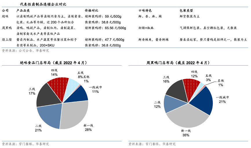 經(jīng)典案例:根據(jù)公司公告、窄門餐眼、華泰研究等綜合資訊表明,絕味食品通過供應(yīng)鏈+性價比的優(yōu)勢閉環(huán)構(gòu)建產(chǎn)品競爭力,從定價上看,絕味 500g 鴨脖散裝/鎖鮮裝定價分別為 38.8/59.0 元,均低于周黑鴨鎖鮮裝鴨脖的65.6 元,略 高于煌上煌,產(chǎn)品定價端具備一定優(yōu)勢。
