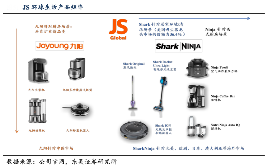 經(jīng)典案例:根據(jù)公司官網(wǎng)、東吳證券研究所等綜合資訊表明,九陽公司在產(chǎn)品拓展分為縱向和橫向擴(kuò)展兩個方向??v向是九陽引導(dǎo)的廚房小家電場景的垂直拓展,在豆?jié){機(jī)后不斷開拓新品類成為公司新的增長引擎;橫向指通過收購 SharkNinja 開拓出居家環(huán)境場景和西式廚電場景。其集團(tuán)整體的產(chǎn)品矩陣得以完善,在實現(xiàn)多品牌運營的同時,走上小家電出海之路。