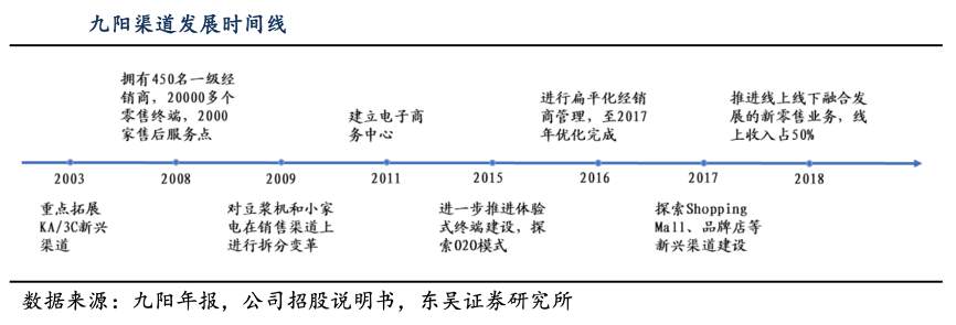 經(jīng)典案例:根據(jù)公司官網(wǎng)、公司招股說明書、東吳證券研究所等綜合資訊表明,九陽公司早在 2011 年成立電子商務(wù)中心,2018年時九陽已經(jīng)打造了線上直銷系統(tǒng)(包括天貓旗艦店,以及微信“九陽商城”),并且分銷網(wǎng)絡(luò)覆蓋了幾乎所有主要的電商平臺(包括三大電商平臺淘寶,京東和蘇寧易購)。截止 2018 年中三大電商平臺的日均流量達(dá)到了 110 萬人次并合計擁有訂閱人次超 1510 萬用戶。