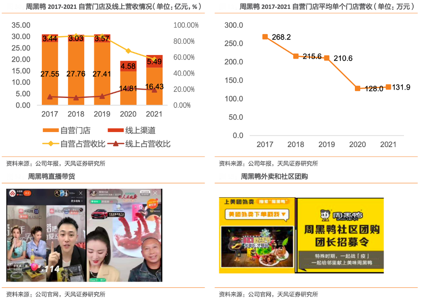 經(jīng)典案例:根據(jù)公司年報、公司官網(wǎng)、天風(fēng)證券研究所等綜合資訊表明,周黑鴨分銷售渠道來看,公司自營門店始終為主要銷售收入來源,2017-2021 年占比均超過 55%。其中,2020 與 2021 年 占比從 2019 年的 86%降至68%及 57%,出現(xiàn)明顯下降趨勢。同時受疫情影響,消費場景逐漸向線上轉(zhuǎn)移,公司緊跟這一變化,通過渠道拓展、產(chǎn)品研發(fā)和數(shù)字化賦能等策略在線上電商業(yè)務(wù)方面取得顯著成效,同時通過外賣和社區(qū)團購齊發(fā)力,順利提升公司線上營收及占比。