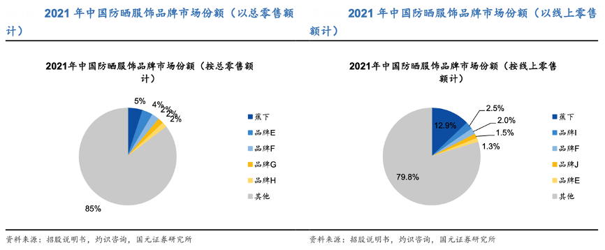 經(jīng)典案例:根據(jù)招股說明書、灼識咨詢、國元證券研究所等綜合資訊表明,蕉下是中國最大防曬服飾品牌,線上零售額超第二名 5 倍。2021 年中國防曬服飾品牌按總零售額,CR5為14.6%,其中蕉下市場份額為5.0%;線上零售額 CR5 為20.2%,其中蕉下占比12.9%,且市場規(guī)模超第二名 5 倍以上。