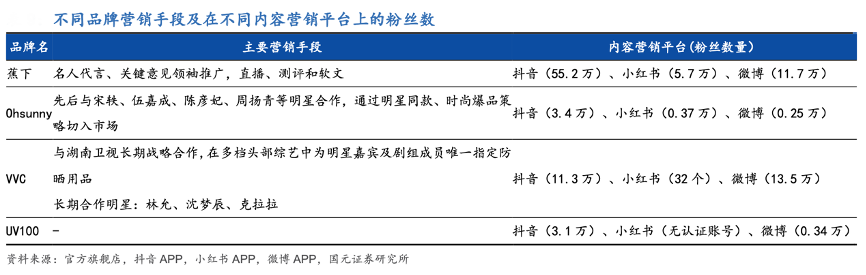 經(jīng)典案例:根據(jù)官方旗艦店、抖音APP、小紅書APP、微博APP、國元證券研究所等綜合資訊表明,除頭部直播間以外,截至 2021 年 6 月 10 日的近一個月內(nèi)蕉下在淘寶直播共合作主播 63 人,總銷售額達 1.17 億。在抖音、小紅書、微博等內(nèi)容營銷平臺上,蕉下的粉絲數(shù)量也同樣遠超于同行業(yè)。
