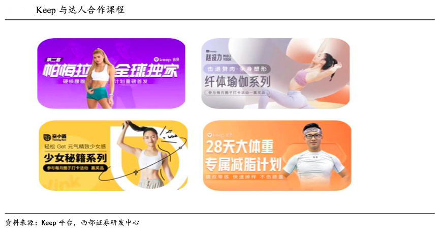 經(jīng)典案例:根據(jù)Keep平臺(tái)、西部證券研發(fā)中心等綜合資訊表明,Keep將提供運(yùn)營(yíng)分析,幫助達(dá)人更好地了解粉絲的喜好,并提供與平臺(tái)合作制作優(yōu)質(zhì)內(nèi)容的機(jī)會(huì)。對(duì)于高人氣和富有創(chuàng)意的達(dá)人,Keep 會(huì)將他們直接介紹給廣告主,以擴(kuò)大他們的變現(xiàn)機(jī)會(huì)。截至 2021 年 12 月 31 日,健身達(dá)人,健身專業(yè)人士和內(nèi)容提供商有 7600 個(gè)健身課程在 Keep 平臺(tái)上。