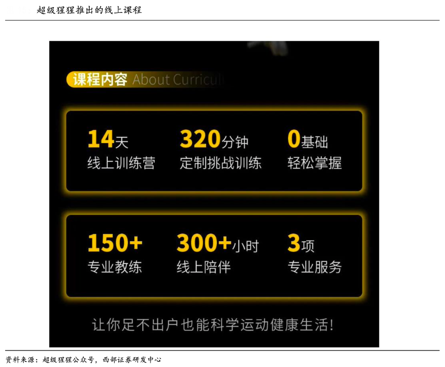 經(jīng)典案例:根據(jù)超級(jí)猩猩、西部證券研發(fā)中心等綜合資訊表明,以超級(jí)猩猩為例,2020年 1 月 31 日,在抖音推出了第一場(chǎng)直播,在線人數(shù)超過(guò)了 17 萬(wàn);同年 2 月 10 號(hào),其正式宣布推出 14 天線上「陪」訓(xùn)營(yíng),通過(guò)教練組建企業(yè)微信班級(jí)群的方式,提供飲食建議和定制訓(xùn)練計(jì)劃的服務(wù)。