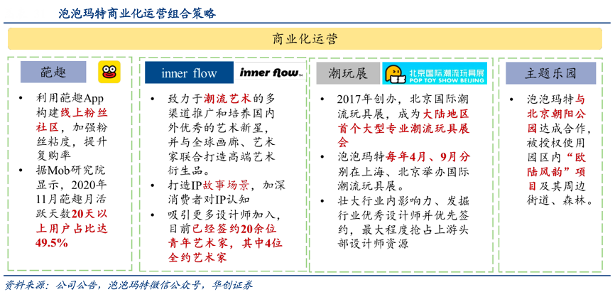 經(jīng)典案例:根據(jù)公司公告、泡泡瑪特微信公眾號(hào)、華創(chuàng)證券等綜合資訊表明,2017年起泡泡瑪特每年分別在北上舉辦 2 次大型潮玩展,培育新用戶(hù)和鞏固老玩家的同時(shí),亦可優(yōu)先獲得頭部藝術(shù)家資源;2021年成立藝術(shù)推廣機(jī)構(gòu) inner flow,通過(guò)限量發(fā)售藝術(shù)家作品和發(fā)布藝術(shù)家采訪擴(kuò)大影響力,截至 2022 年 4 月其已與 Ashley 和 Lang 等 13 名藝術(shù)家建立合作。