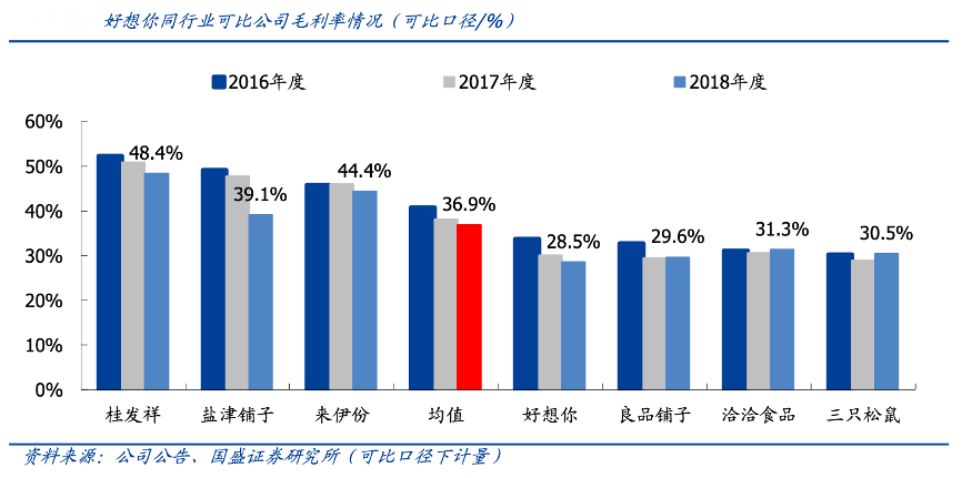 經(jīng)典案例:根據(jù)公司公告、國盛證券研究所等綜合資訊表明,在休閑食品行業(yè)中,線下為主的品牌毛利率略高,線上為主的品牌毛利率較低。2018年,休閑食品上市公司可比平均毛利率為36.9%,鹽津鋪?zhàn)印硪练莸让示^高。