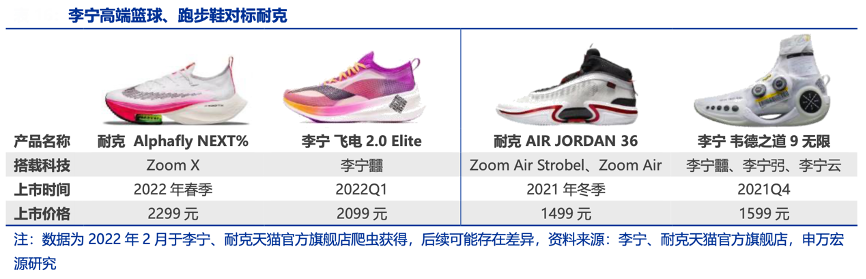 經(jīng)典案例:根據(jù)李寧、耐克天貓官方旗艦店、申萬宏源研究等綜合資訊表明,李寧高端產(chǎn)品直接與國際品牌正面競爭。2019 年,李寧成為第一個推出以 PEBA 作為中底材 料的本土品牌,突破了耐克的封鎖,通過高價旗艦運動跑鞋打入高端運動鞋市場,并通過營銷 和良好的口碑在消費者心目中逐漸樹立國產(chǎn)科技值得購買,不比國外品牌差的印象。搭載“李 寧?科技”的“飛電 2.0 Elite”跑鞋、“韋德之道 9 無限”籃球鞋,在外形設(shè)計、功能屬性、價格層級等方面直接對標耐克“Alphafly NEXT%”跑鞋和“LEBRON19”運動鞋。