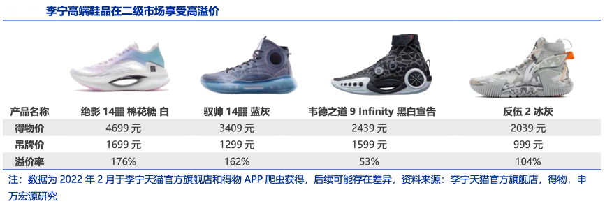 經(jīng)典案例:根據(jù)李寧天貓官方旗艦店、得物、申萬宏源研究等綜合資訊表明,李寧公司在高端產(chǎn)品上的營銷對標國際品牌,采取饑餓營銷策略,限量發(fā)售新品。對于一些限量重磅鞋款,消費者只能通過限號抽簽的方式進行購買,部分抽簽活動只有達到金牌等級會員、且需要穿著指定系列的產(chǎn)品才有資格進行購買。受限于較高的購買資質(zhì)及較低的中簽率,李寧高端鞋品在轉(zhuǎn)賣市場存在較高溢價,“絕影 14 ?“棉花糖配色溢價率達176%,“馭帥 14?”藍灰配色款溢價率高達162%。