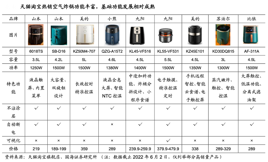 經(jīng)典案例:根據(jù)天貓?zhí)詫毱炫灥辍?guó)海證券研究所等綜合資訊表明,空氣炸鍋從傳統(tǒng)的旋鈕機(jī)械款升 級(jí)到電子液晶屏,目前均勻加熱等技術(shù)基本已經(jīng)落地。為提升設(shè)備可操作性,產(chǎn)品設(shè)計(jì)和材料選擇上也更加人性化科技化,如自動(dòng)斷電、食品級(jí)不沾涂層、大屏觸控的使用提升了使用安全性、精度和使用體驗(yàn)。