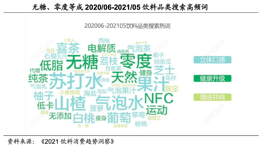 經(jīng)典案例:根據(jù)《2021飲料消費(fèi)趨勢(shì)洞察》、國(guó)海證券研究所等綜合資訊表明,眾多品牌推出無(wú)糖飲品,2005年可口可樂(lè)零度產(chǎn)品引領(lǐng)無(wú)糖無(wú)熱量風(fēng)向,2018年元?dú)馍滞瞥?nbsp;0 糖 0 脂肪 0 卡路里蘇打氣泡水迅速搶占市場(chǎng),2020 年喜茶、奈雪的茶推出無(wú)糖氣泡水進(jìn)軍無(wú)糖市場(chǎng)。結(jié)合《2021飲料消費(fèi)趨勢(shì)洞察》顯示,“立體口感、健康升級(jí)、情感共鳴”成為飲料市場(chǎng)三大新消費(fèi)趨勢(shì),無(wú)糖、零度等成為飲料品類搜索高頻詞,無(wú)糖產(chǎn)品備受消費(fèi)者青睞。