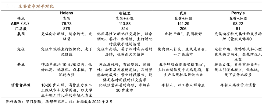 經(jīng)典案例:根據(jù)窄門餐眼、德邦研究所等綜合資訊表明,行業(yè)內(nèi)海倫司的競爭對手主要有貳麻酒館、Perry’s、胡桃里等,在滿足消費者夜間娛樂的基礎上,各品牌采用不同的產(chǎn)品定價、環(huán)境氛圍設置,聚焦消費者 的不同需求。其中Perry’s:強調拼桌文化,適合多人休閑或陌生人社交,客戶群和海倫司最像,但 Perry’s更像一個量販式嗨場,介于清吧和嗨吧之間,顧客會自發(fā)的地去跳舞。