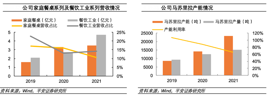 其提出“餐飲進中餐”,從年輕一代入手培養(yǎng)國人的奶酪消費習慣。經過2021 年的產能擴張,目前公司馬蘇里拉奶酪的產能基本充足,產能利用率為65.41%,為公司推動“餐飲進中餐”提供了產能保證。