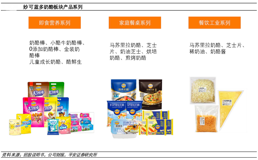 經典案例:根據wind、平安證券研究所等綜合資訊表明,妙可藍多公司的馬蘇里拉奶酪主要分為家庭餐桌系列和餐飲工業(yè)系列,50g小包裝的馬蘇里拉芝士面向家庭端,3.6kg大包裝的馬蘇里拉芝士面向終端連鎖餐飲。2021 年家庭餐桌系列營收占比為 10.54%,餐飲工業(yè)系列營收占比為 14.09%。