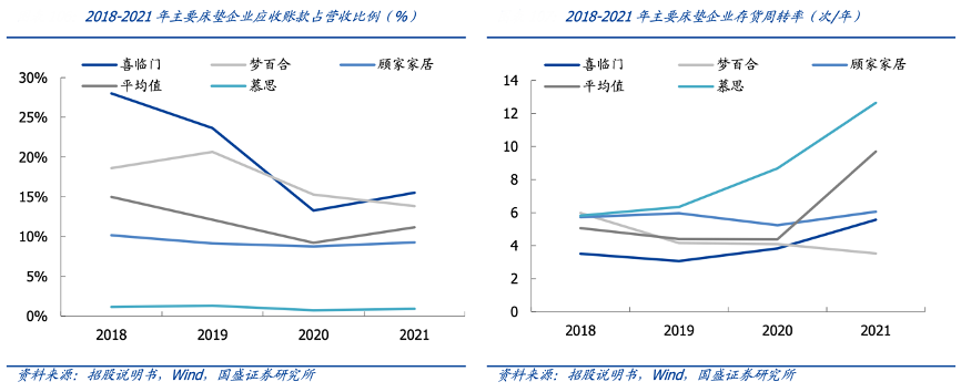 經(jīng)典案例:根據(jù)招股說(shuō)明書(shū)、wind、國(guó)盛證券研究所等綜合資訊表明,慕斯生產(chǎn)管理能力突出,以銷(xiāo)定產(chǎn),優(yōu)化庫(kù)存。其主要銷(xiāo)售自主品牌,且智能決策管理平臺(tái)通過(guò)集成 CRM、SAP、APS、MES 等系統(tǒng),打通訂單一體化生產(chǎn)流程,并支持按需定制 C2M 商業(yè)模式,可以根據(jù)客戶需求迅速做出反應(yīng)并進(jìn)行排產(chǎn),因此公司存貨周轉(zhuǎn)效率明顯高于可比公司,2021年公司存貨周轉(zhuǎn)率 12.64 次 /年,顯著高于喜臨門(mén) 5.56 次/年、夢(mèng)百合 3.52 次/年,顧家家居 6.05 次/年。