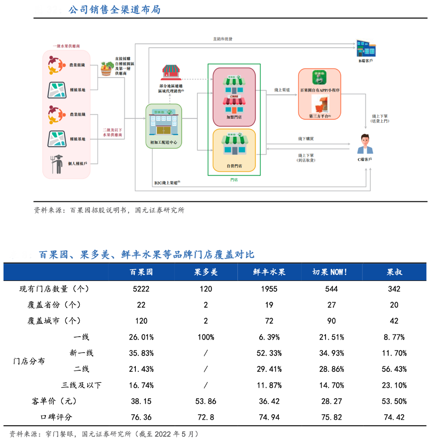 經(jīng)典案例:根據(jù)百果園招股說明書、窄門餐眼、國元證券研究所等綜合資訊說明,目前百果園公司旗下主要有百果園和果多美兩大渠道品牌。“百果園”為公司自創(chuàng)品牌,面向中高端市場消費(fèi)者提供高品質(zhì)果品;果多美則是2017 年底收購所得的區(qū)域性渠道品牌。根據(jù)窄門餐眼 APP 數(shù)據(jù),截至 2022 年 5 月,百果園品牌下共有 5222 家門店,覆蓋全國 120 個(gè)城市,一線城市占比26.01%、新一線城市占比 35.83%。
