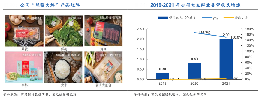 經(jīng)典案例:根據(jù)百果園招股說明書、國元證券研究所等綜合資訊說明,百果園公司近年來橫向拓展 SKU,將水果零售的成功經(jīng)驗(yàn)復(fù)制至“大生鮮”板塊。2020年底公司推出生鮮自有品牌“熊貓大鮮”,主要分銷包括非標(biāo)品的產(chǎn)品蔬菜、鮮肉、海鮮等,以及預(yù)包裝的標(biāo)品如糧油、乳制品等,截至 202 1 年底品牌業(yè)務(wù)覆蓋超 100 種大生鮮品類。2021年公司大生鮮業(yè)務(wù)營收為 2 億元,同比增長 150.0%,占產(chǎn)品銷售總收入比重由 2019 年的 0.4%提升至2.0%。