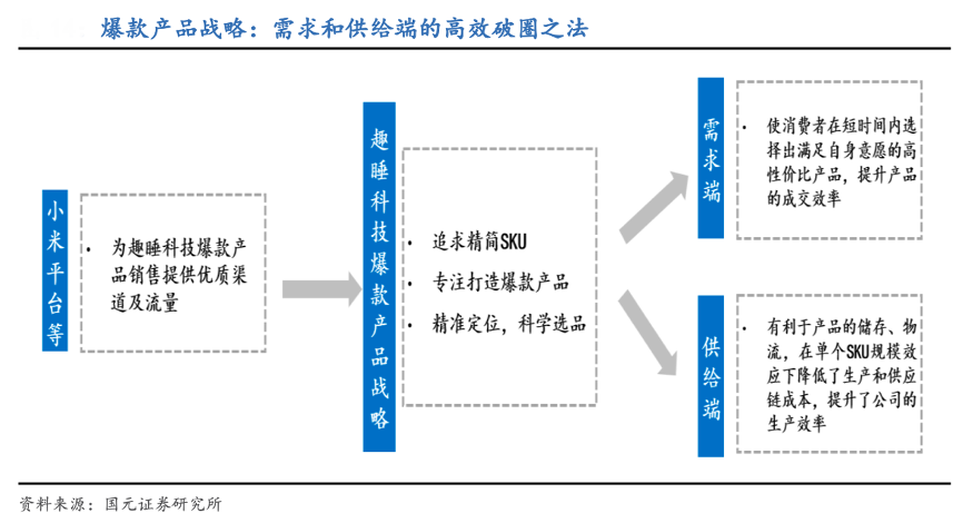 經(jīng)典案例:根據(jù)國元證券研究所等綜合資訊表明,趣睡科技推進(jìn)“爆款產(chǎn)品戰(zhàn)略”,近年來爆款產(chǎn)品在趣睡科技的營收比重較大,2018-2020 年比重均超30%,至 2021H1仍有約36.0%;而當(dāng)年爆款新品在總爆款收入及總營收中的比重 亦維持在相對高位,2019-2020年二者的比重分別為 25.9%/23.4%和 10.4%/7.5%。