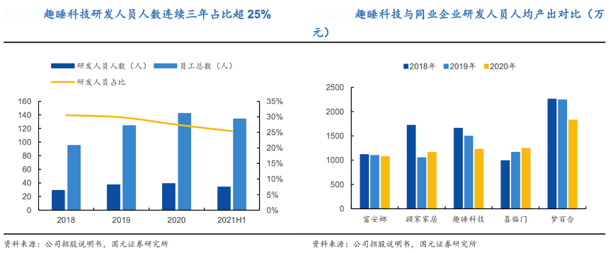 經(jīng)典案例:根據(jù)公司招股說(shuō)明書(shū)、國(guó)元證券研究所等綜合資訊表明,趣睡科技近年來(lái)不斷加碼產(chǎn)品的研發(fā)創(chuàng)新設(shè)計(jì), 2018-2020 年公司研發(fā)人員比重均超 25%,在研發(fā)人員人均產(chǎn)出上其也表現(xiàn)良好,位于行業(yè)平均水平。從研發(fā)費(fèi)用角度看,其研發(fā)費(fèi)用率常年超 1.1%。截至 2021 年 8 月,公司累計(jì)取得 174 項(xiàng)專利,掌握了壓縮打卷、免安裝工藝、抽屜分層、拼裝減震、人體工學(xué)結(jié)構(gòu)設(shè)計(jì)、鵝絨被斜立襯、枕頭復(fù)合結(jié)構(gòu)設(shè)計(jì)等核心技術(shù)。