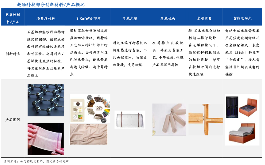 經(jīng)典案例:根據(jù)公司招股說(shuō)明書(shū)、國(guó)元證券研究所等綜合資訊表明,趣睡科技公司目前超過(guò)50%的產(chǎn)品款式使用新材料;在新產(chǎn)品方面,公司研發(fā)團(tuán)隊(duì)通過(guò)電商平臺(tái)大數(shù)據(jù)實(shí)時(shí)關(guān)注消費(fèi)者購(gòu)買需求及評(píng)價(jià),以推出遵循消費(fèi)者需求的創(chuàng)新產(chǎn)品。近年來(lái),其已先后推出卷裝床墊、卷裝枕頭、智能電動(dòng)床等創(chuàng)新產(chǎn)品,可滿足消費(fèi)者多種需求。