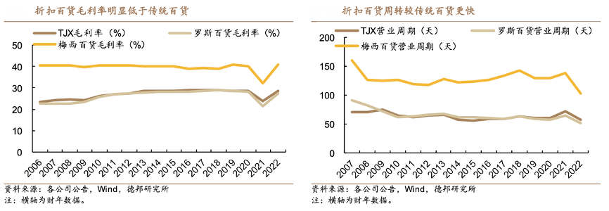 經(jīng)典案例:根據(jù)各公司公告、wind、德邦研究所等綜合資訊表明,折扣零售的代表包括美國的TJX、羅斯百貨,折扣零售的核心驅(qū)動力就在于性價比,通過專業(yè)選品團(tuán)隊精選,并憑借連鎖經(jīng)營的規(guī)模壓低價格,與傳統(tǒng)百貨的差異在于毛利、周轉(zhuǎn)。