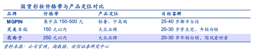 MGPIN 產(chǎn)品定位輕奢、中高端,價格帶集中在150-500元,主要面向25-40歲的都市女性,與完美日記、花西子等主要針對學(xué)生黨和年輕白領(lǐng)的大眾品牌拉開差距。MGPIN立足于東方美學(xué)理念,針對東方女性不同的面部特征、膚質(zhì)與膚色進行產(chǎn)品設(shè)計,更貼合國人需求。