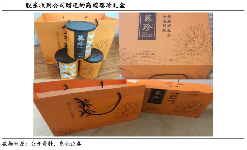 經(jīng)典案例:根據(jù)公開資料、東北證券等綜合資訊表明,洽洽以高端“葵珍”系列精品瓜子瞄準(zhǔn)高端人群,通過(guò)高端俱樂部、茶樓、私人會(huì)所、會(huì)議等渠道精準(zhǔn)對(duì)接高端人群,增強(qiáng)其消費(fèi)黏性。其于 2021 年對(duì)葵珍系列進(jìn)行原料包裝升級(jí),同時(shí)于 2022 年 5 月下旬發(fā)布公告贈(zèng)予公司股東葵珍禮盒并收集反饋,2022年?duì)I收預(yù)計(jì)突破億級(jí)體量并帶動(dòng)毛利率提高。