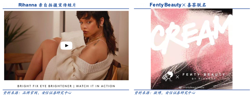 經(jīng)典案例:根據(jù)品牌官網(wǎng)、安信證券研究中心等綜合資訊表明,F(xiàn)enty Beauty 由流行天后 Rihanna 于 2016 年創(chuàng)立,隸屬 LVMH 集團(tuán)旗下,2019 年 9 月 Fenty Beauty 正式進(jìn)軍亞洲,開通了微博、微信公眾號(hào)、小紅書 等社交賬戶,同時(shí) Rihanna 登上《時(shí)尚芭莎》封面為品牌制造聲量。為本土化營(yíng)銷,2020 年 5 月 Fenty Beauty 和喜茶推出聯(lián)名產(chǎn)品,進(jìn)一步提高在中國(guó)年輕人中的知名度。